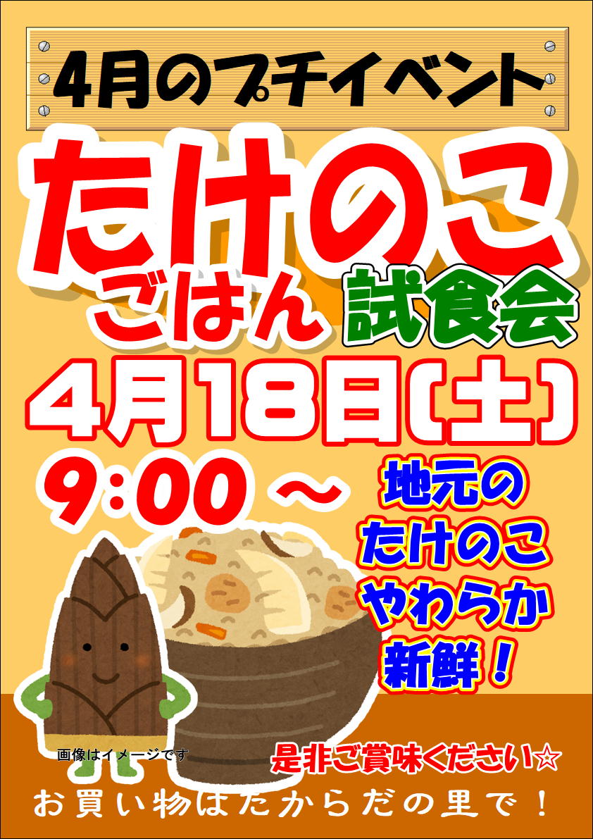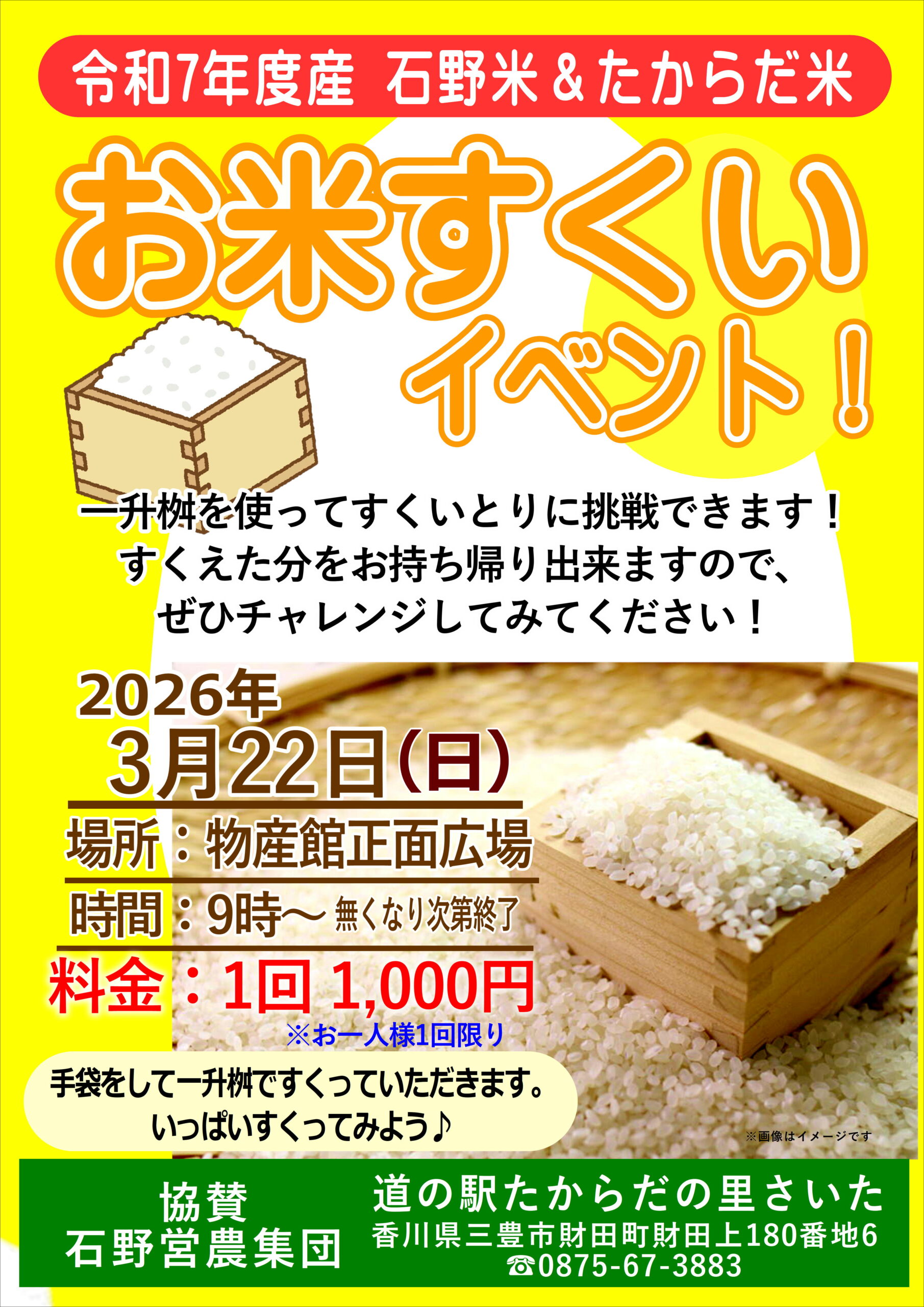 「つきたてお餅のふるまい」や「ガラポン抽選会」、「野菜の詰め放題」など、お客様に喜んでいただけるイベントを開催します。旬の野菜や果物、自慢の「たからだ米」の特別販売、テント出店など楽しいことが目白押し!