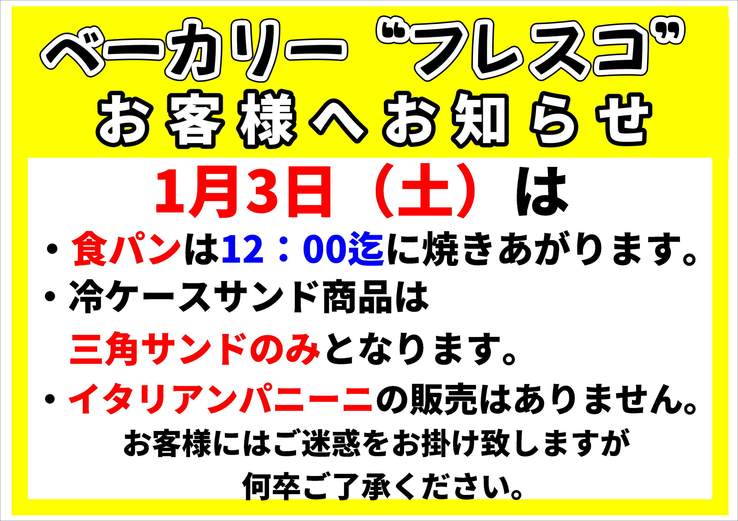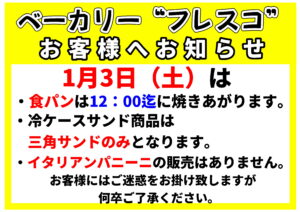 ベーカリーお知らせ0103 投稿者 作成者: adminmaster 投稿日 2025年12月31日 ベーカリーお知らせ0103 へのコメントはまだありません コメントを残す コメントをキャンセルメールアドレスが公開されることはありません。 ※ が付いている欄は必須項目ですコメント ※ 名前 ※ メール ※ サイト 次回のコメントで使用するためブラウザーに自分の名前、メールアドレス、サイトを保存する。 上に表示された文字を入力してください。